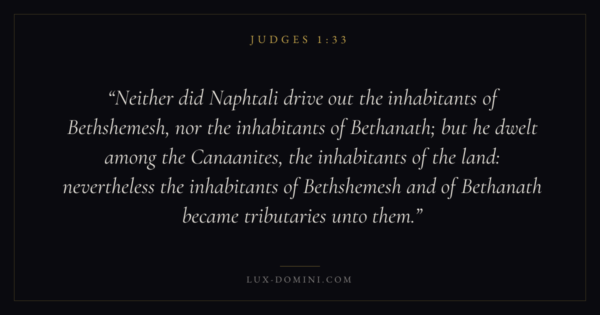 Neither did Naphtali drive out the inhabitants of Bethshemesh, nor the inhabitants of Bethanath; but he dwelt among the Canaanites, the inhabitants of the land: nevertheless the inhabitants of Bethshemesh and of Bethanath became tributaries unto them.