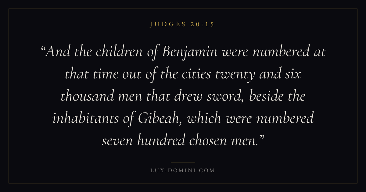 And the children of Benjamin were numbered at that time out of the cities twenty and six thousand men that drew sword, beside the inhabitants of Gibeah, which were numbered seven hundred chosen men.