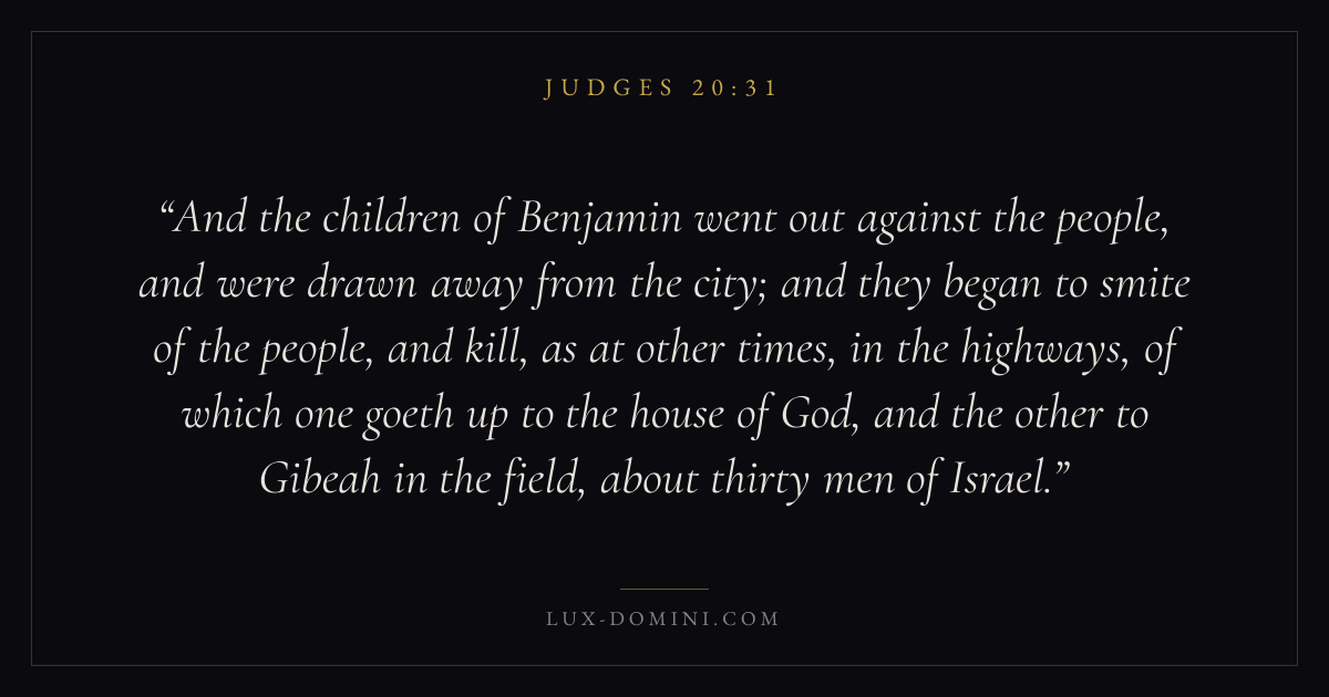 And the children of Benjamin went out against the people, and were drawn away from the city; and they began to smite of the people, and kill, as at other times, in the highways, of which one goeth up to the house of God, and the other to Gibeah in the field, about thirty men of Israel.