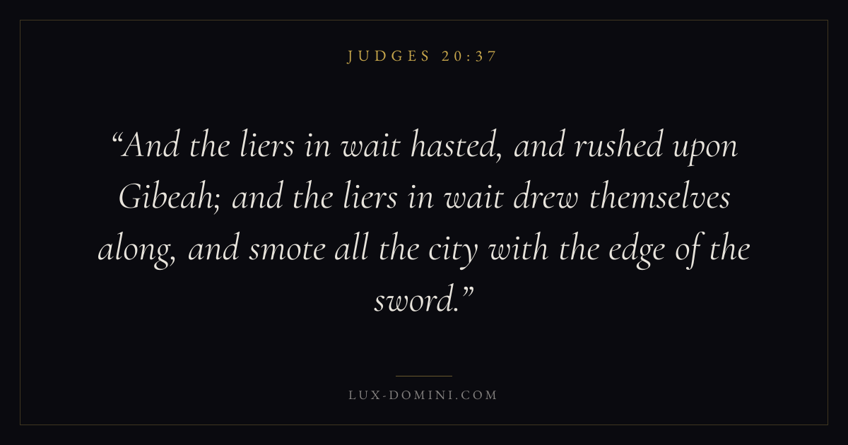 And the liers in wait hasted, and rushed upon Gibeah; and the liers in wait drew themselves along, and smote all the city with the edge of the sword.