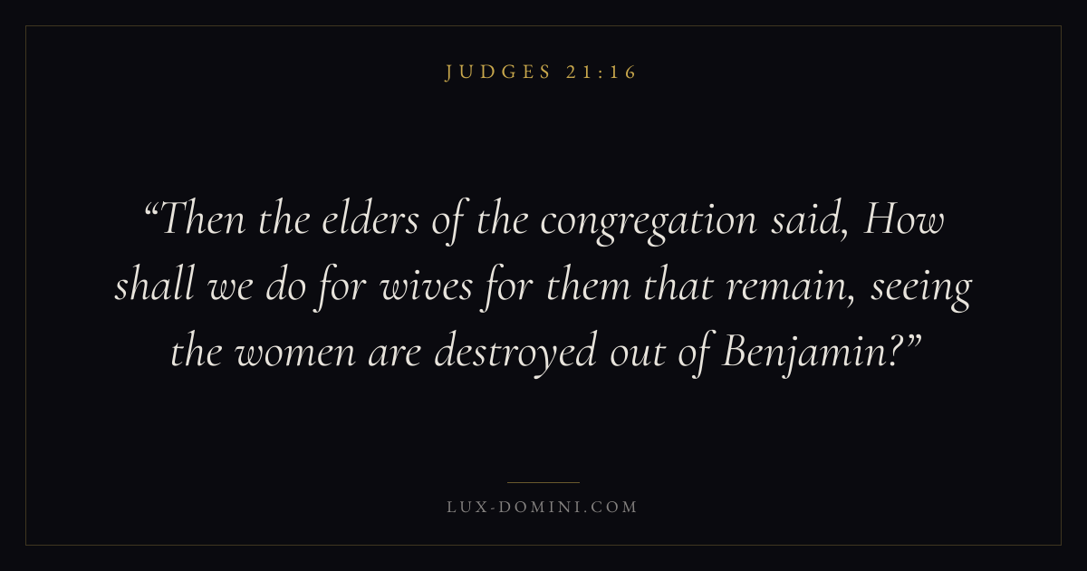 Then the elders of the congregation said, How shall we do for wives for them that remain, seeing the women are destroyed out of Benjamin?