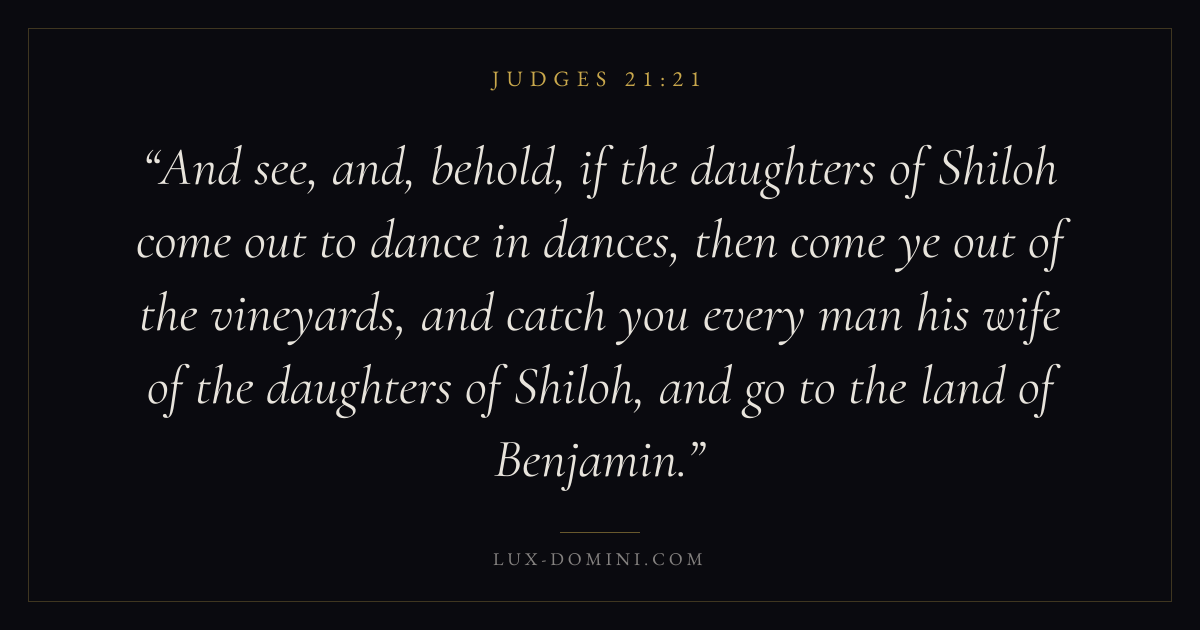 And see, and, behold, if the daughters of Shiloh come out to dance in dances, then come ye out of the vineyards, and catch you every man his wife of the daughters of Shiloh, and go to the land of Benjamin.