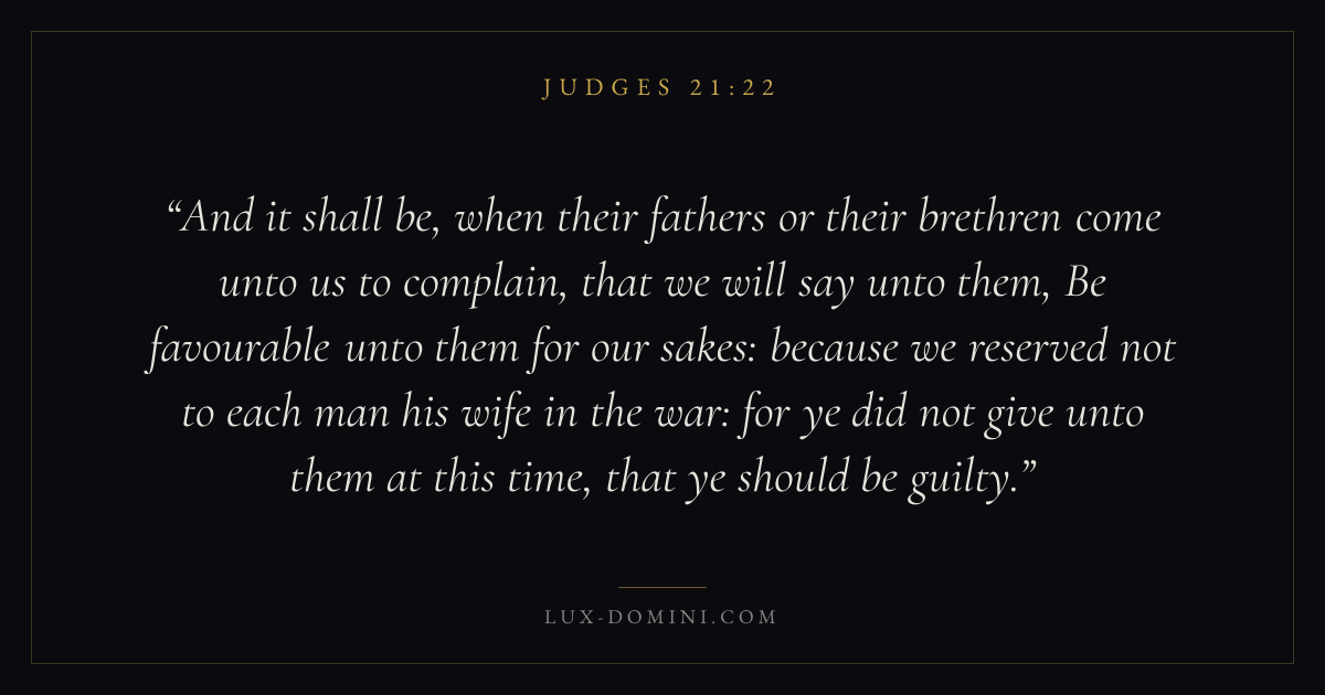 And it shall be, when their fathers or their brethren come unto us to complain, that we will say unto them, Be favourable unto them for our sakes: because we reserved not to each man his wife in the war: for ye did not give unto them at this time, that ye should be guilty.