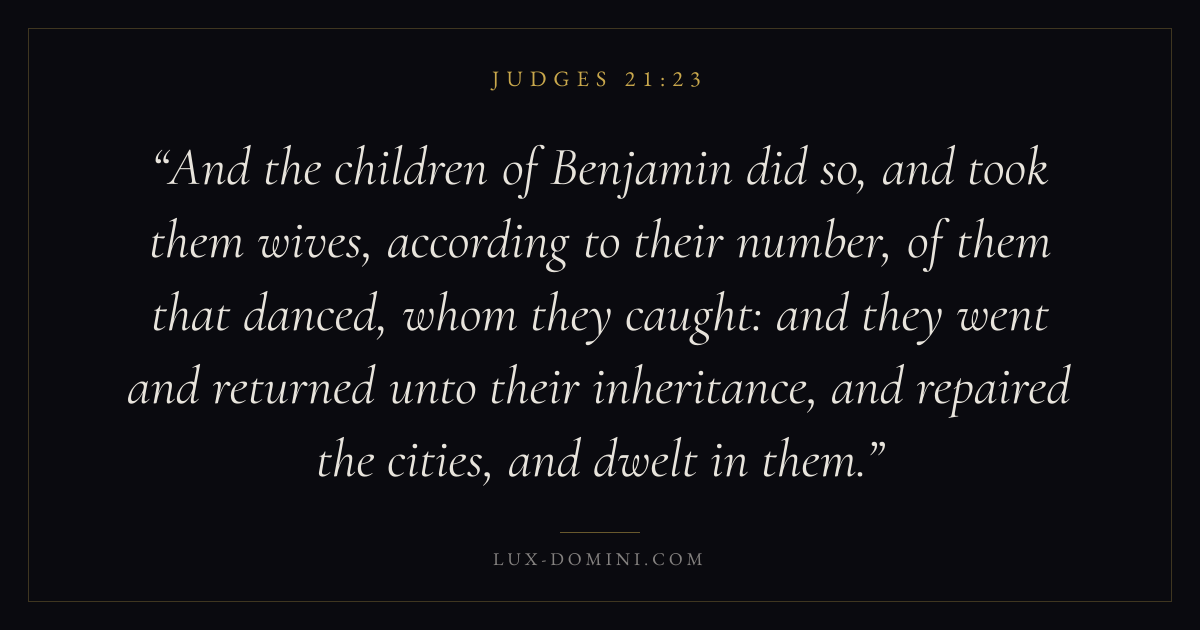 And the children of Benjamin did so, and took them wives, according to their number, of them that danced, whom they caught: and they went and returned unto their inheritance, and repaired the cities, and dwelt in them.