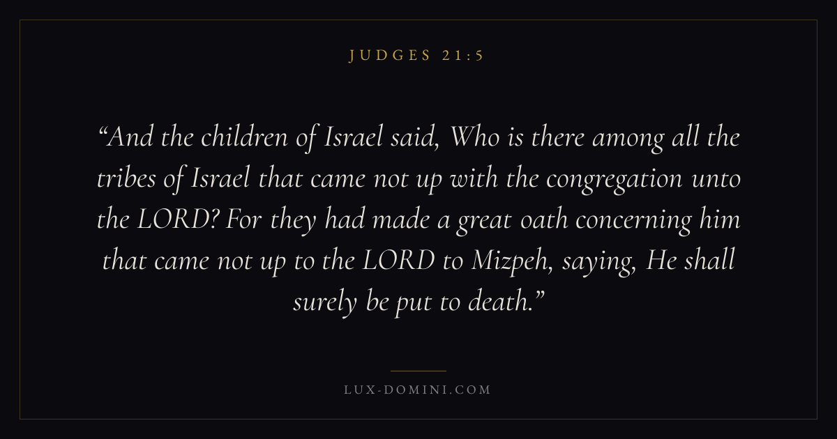 And the children of Israel said, Who is there among all the tribes of Israel that came not up with the congregation unto the LORD? For they had made a great oath concerning him that came not up to the LORD to Mizpeh, saying, He shall surely be put to death.