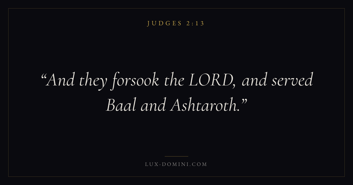 Books / Judges / Chapter 2 / Verse 13 ← Judges 2:12 Judges 2:13 Judges 2:14 → And they forsook the LORD, and served Baal and Ashtaroth. Download verse card Share on Twitter Share on Facebook Pin it ✦ Key themes Justice and mercySalvationApostasyDeliverance Read with Judges 2:11Judges 2:12Micah 6:8Amos 5:24 Related topics Bible verses about justice and mercyBible verses about salvation ✦ Judges Chapter 2 verses V. 1 V. 2 V. 3 V. 4 V. 5 V. 6 V. 7 V. 8 V. 9 V. 10 V. 11 V. 12 V. 13 V. 14 V. 15 V. 16 V. 17 V. 18 V. 19 V. 20 V. 21 V. 22 V. 23