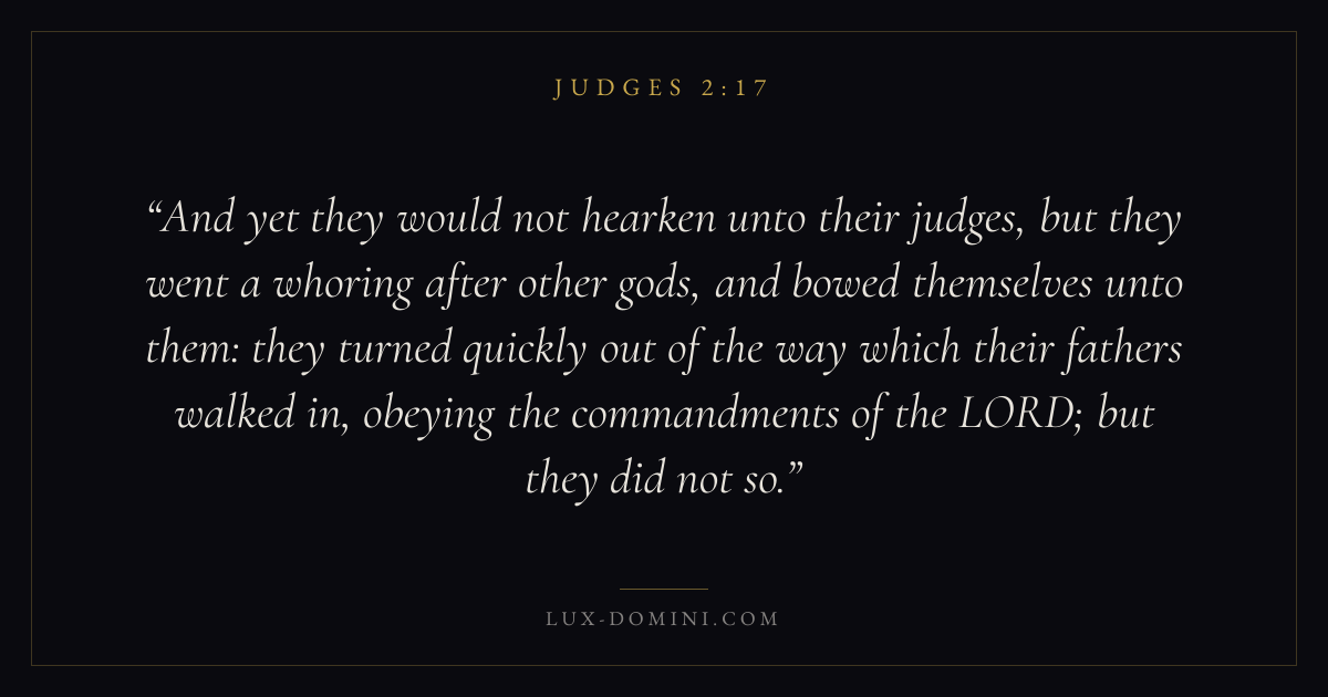 And yet they would not hearken unto their judges, but they went a whoring after other gods, and bowed themselves unto them: they turned quickly out of the way which their fathers walked in, obeying the commandments of the LORD; but they did not so.