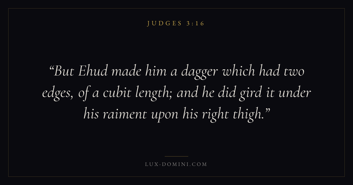 But Ehud made him a dagger which had two edges, of a cubit length; and he did gird it under his raiment upon his right thigh.