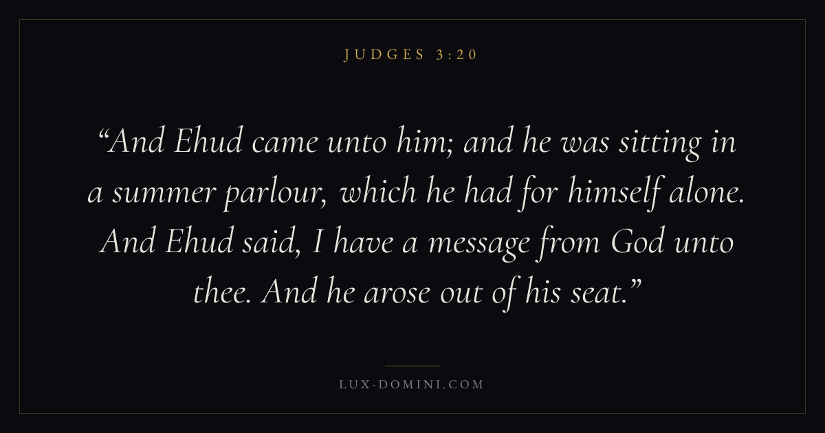 And Ehud came unto him; and he was sitting in a summer parlour, which he had for himself alone. And Ehud said, I have a message from God unto thee. And he arose out of his seat.