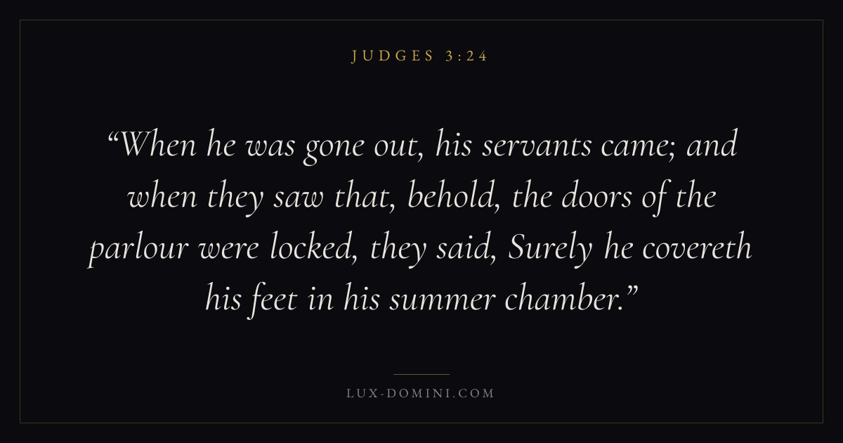When he was gone out, his servants came; and when they saw that, behold, the doors of the parlour were locked, they said, Surely he covereth his feet in his summer chamber.