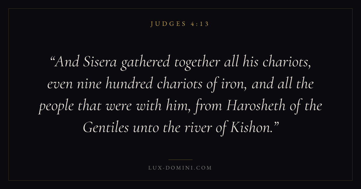 And Sisera gathered together all his chariots, even nine hundred chariots of iron, and all the people that were with him, from Harosheth of the Gentiles unto the river of Kishon.