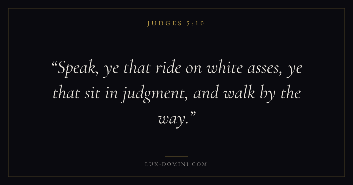 Books / Judges / Chapter 5 / Verse 10 ← Judges 5:9 Judges 5:10 Judges 5:11 → Speak, ye that ride on white asses, ye that sit in judgment, and walk by the way. Download verse card Share on Twitter Share on Facebook Pin it ✦ Key themes Justice and mercySalvationGraceApostasy Read with Judges 5:11Micah 6:8Amos 5:24John 3:16 Related topics Bible verses about justice and mercyBible verses about salvationBible verses about grace ✦ Judges Chapter 5 verses V. 1 V. 2 V. 3 V. 4 V. 5 V. 6 V. 7 V. 8 V. 9 V. 10 V. 11 V. 12 V. 13 V. 14 V. 15 V. 16 V. 17 V. 18 V. 19 V. 20 V. 21 V. 22 V. 23 V. 24 V. 25 V. 26 V. 27 V. 28 V. 29 V. 30 V. 31