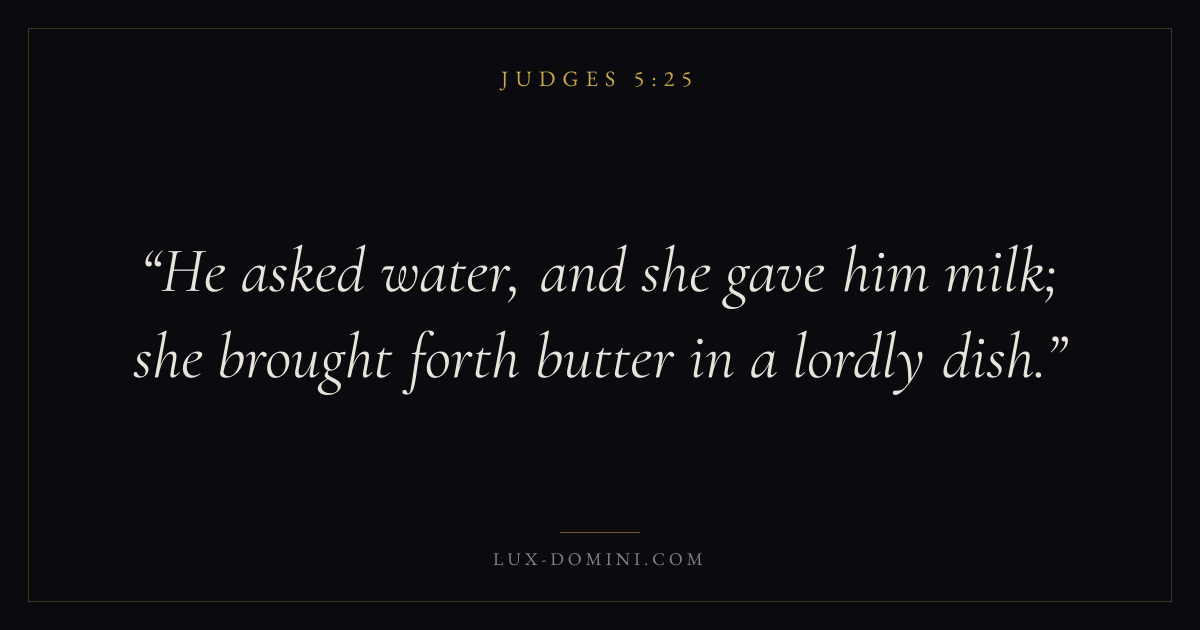 Books / Judges / Chapter 5 / Verse 25 ← Judges 5:24 Judges 5:25 Judges 5:26 → He asked water, and she gave him milk; she brought forth butter in a lordly dish. Download verse card Share on Twitter Share on Facebook Pin it ✦ Key themes PrayerJustice and mercySalvationApostasy Read with Judges 5:24Matthew 6:9Luke 18:1Micah 6:8 Related topics Bible verses about prayerBible verses about justice and mercyBible verses about salvation ✦ Judges Chapter 5 verses V. 1 V. 2 V. 3 V. 4 V. 5 V. 6 V. 7 V. 8 V. 9 V. 10 V. 11 V. 12 V. 13 V. 14 V. 15 V. 16 V. 17 V. 18 V. 19 V. 20 V. 21 V. 22 V. 23 V. 24 V. 25 V. 26 V. 27 V. 28 V. 29 V. 30 V. 31