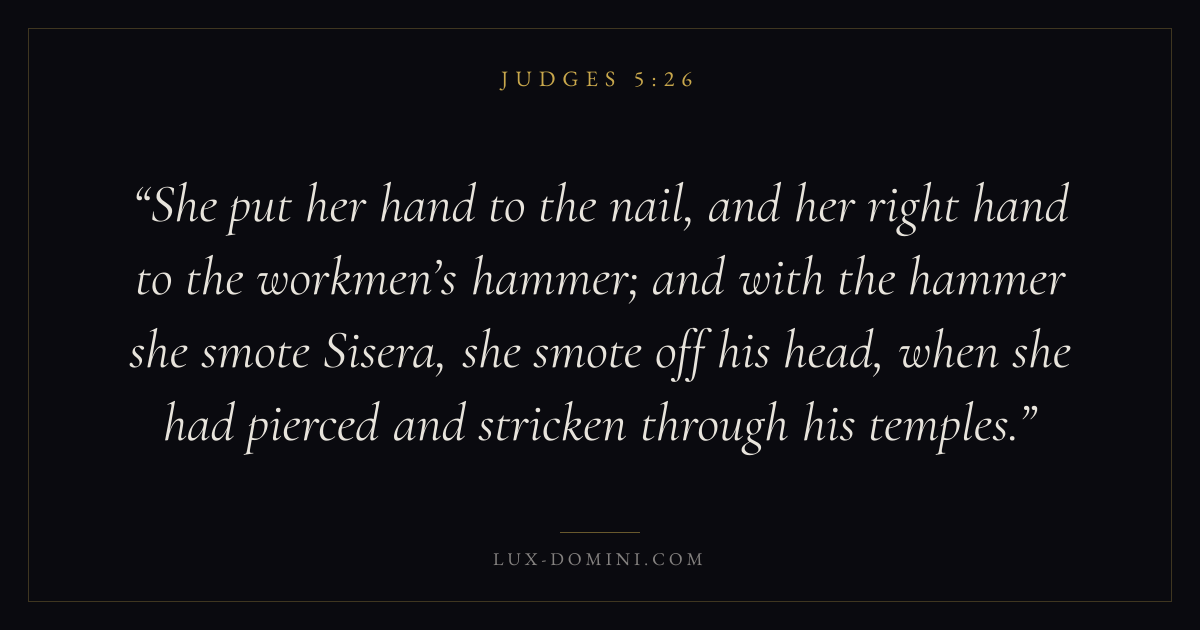 She put her hand to the nail, and her right hand to the workmen’s hammer; and with the hammer she smote Sisera, she smote off his head, when she had pierced and stricken through his temples.
