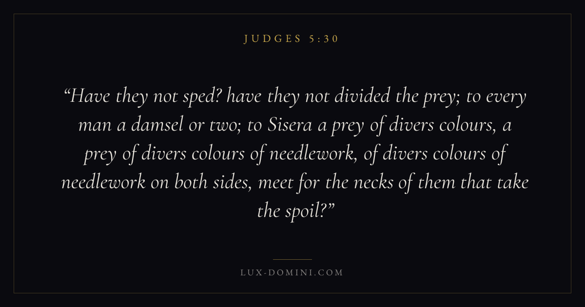 Have they not sped? have they not divided the prey; to every man a damsel or two; to Sisera a prey of divers colours, a prey of divers colours of needlework, of divers colours of needlework on both sides, meet for the necks of them that take the spoil?