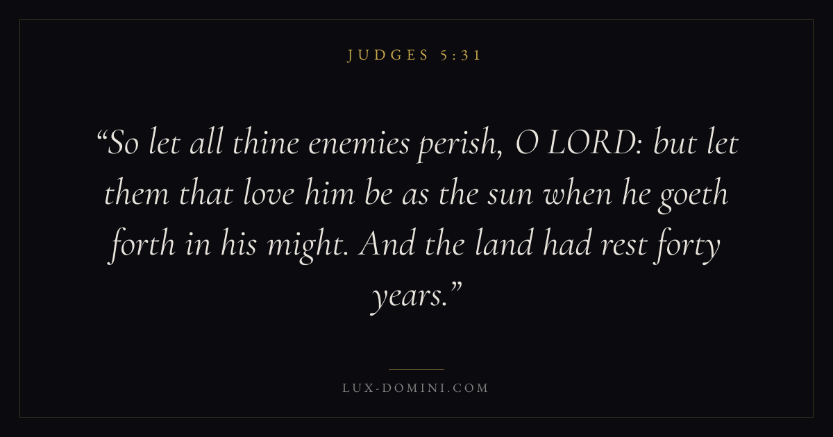 So let all thine enemies perish, O LORD: but let them that love him be as the sun when he goeth forth in his might. And the land had rest forty years.