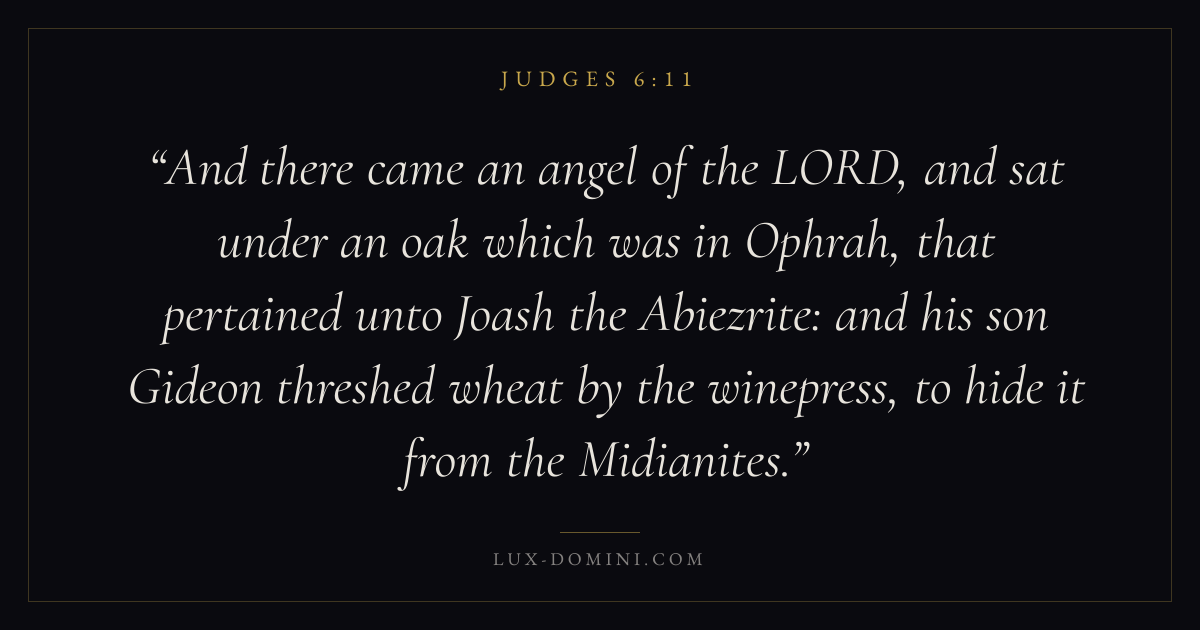 And there came an angel of the LORD, and sat under an oak which was in Ophrah, that pertained unto Joash the Abiezrite: and his son Gideon threshed wheat by the winepress, to hide it from the Midianites.