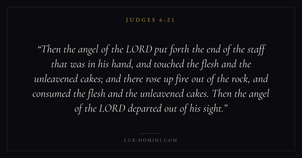 Then the angel of the LORD put forth the end of the staff that was in his hand, and touched the flesh and the unleavened cakes; and there rose up fire out of the rock, and consumed the flesh and the unleavened cakes. Then the angel of the LORD departed out of his sight.