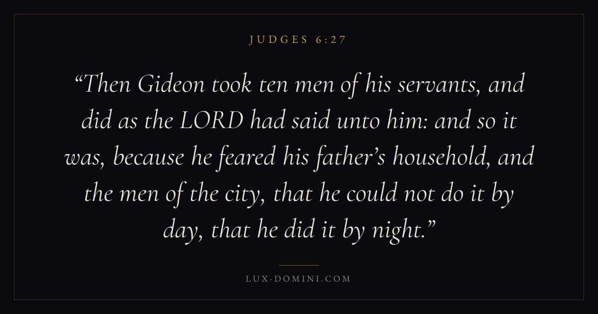 Then Gideon took ten men of his servants, and did as the LORD had said unto him: and so it was, because he feared his father’s household, and the men of the city, that he could not do it by day, that he did it by night.
