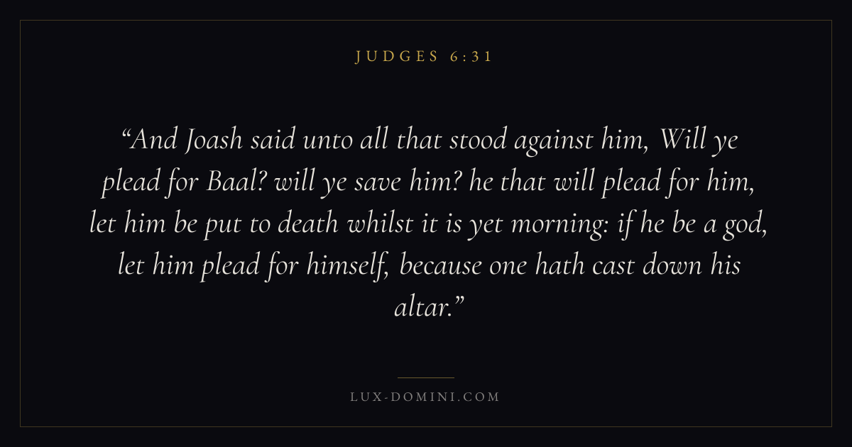 And Joash said unto all that stood against him, Will ye plead for Baal? will ye save him? he that will plead for him, let him be put to death whilst it is yet morning: if he be a god, let him plead for himself, because one hath cast down his altar.