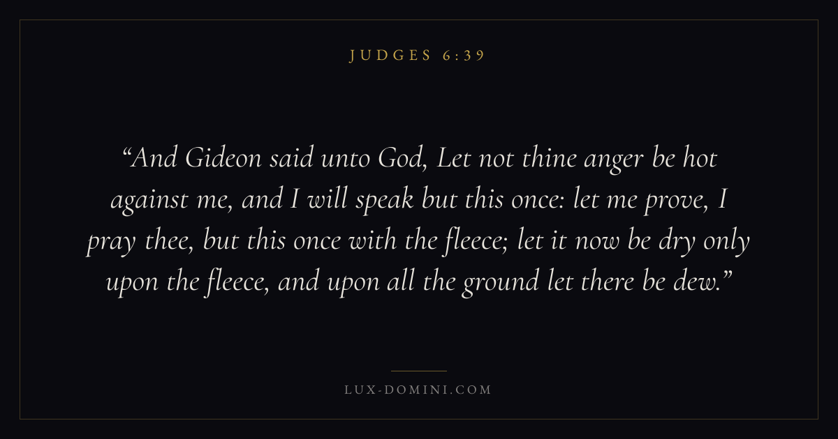 And Gideon said unto God, Let not thine anger be hot against me, and I will speak but this once: let me prove, I pray thee, but this once with the fleece; let it now be dry only upon the fleece, and upon all the ground let there be dew.