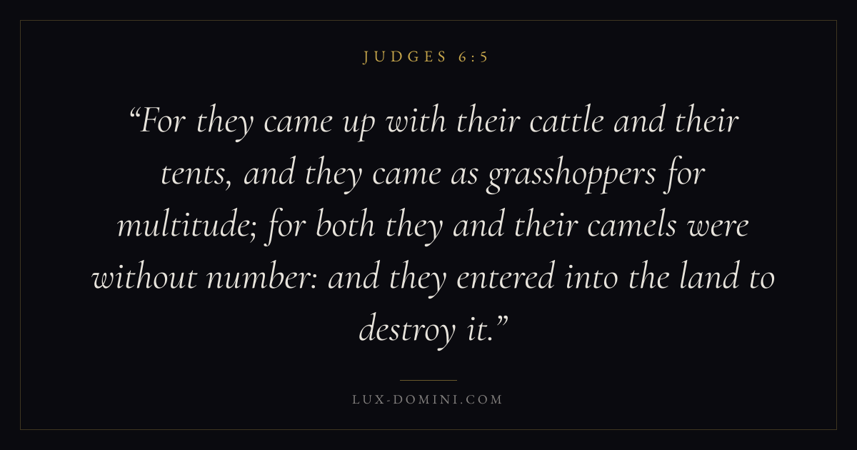 For they came up with their cattle and their tents, and they came as grasshoppers for multitude; for both they and their camels were without number: and they entered into the land to destroy it.