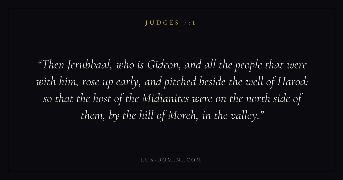 Then Jerubbaal, who is Gideon, and all the people that were with him, rose up early, and pitched beside the well of Harod: so that the host of the Midianites were on the north side of them, by the hill of Moreh, in the valley.