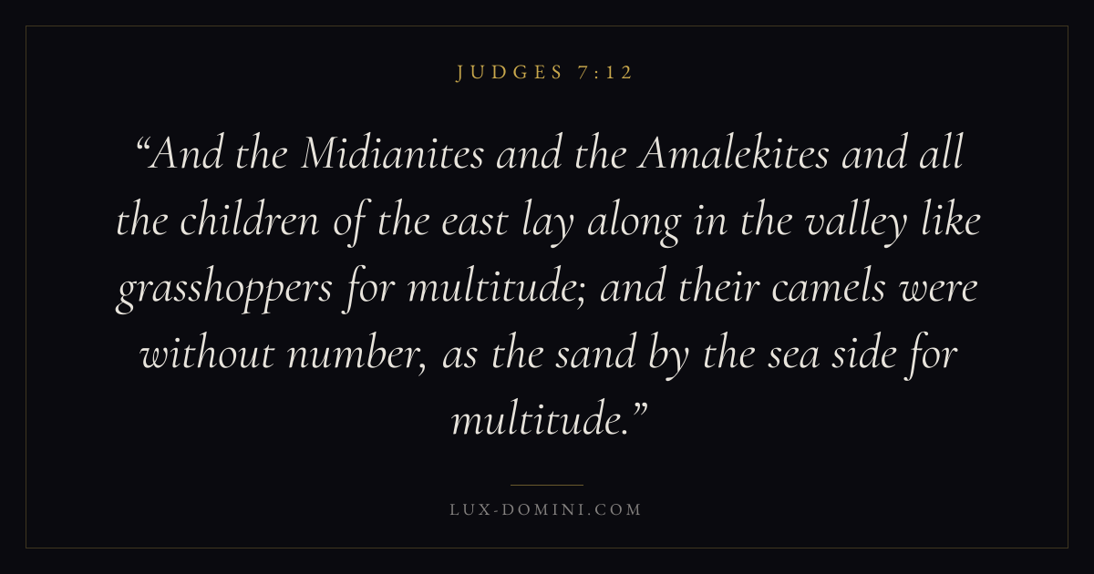 And the Midianites and the Amalekites and all the children of the east lay along in the valley like grasshoppers for multitude; and their camels were without number, as the sand by the sea side for multitude.