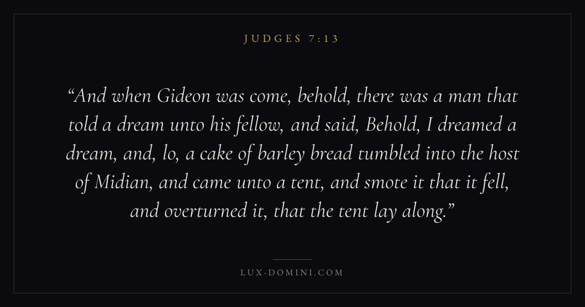 And when Gideon was come, behold, there was a man that told a dream unto his fellow, and said, Behold, I dreamed a dream, and, lo, a cake of barley bread tumbled into the host of Midian, and came unto a tent, and smote it that it fell, and overturned it, that the tent lay along.