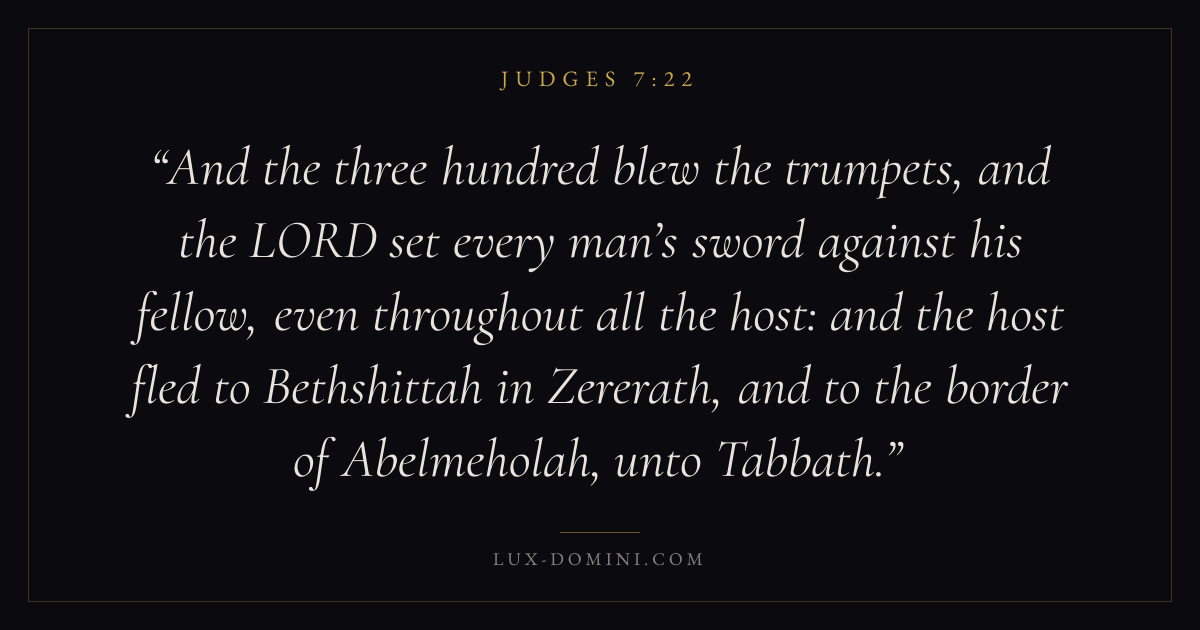 And the three hundred blew the trumpets, and the LORD set every man’s sword against his fellow, even throughout all the host: and the host fled to Bethshittah in Zererath, and to the border of Abelmeholah, unto Tabbath.