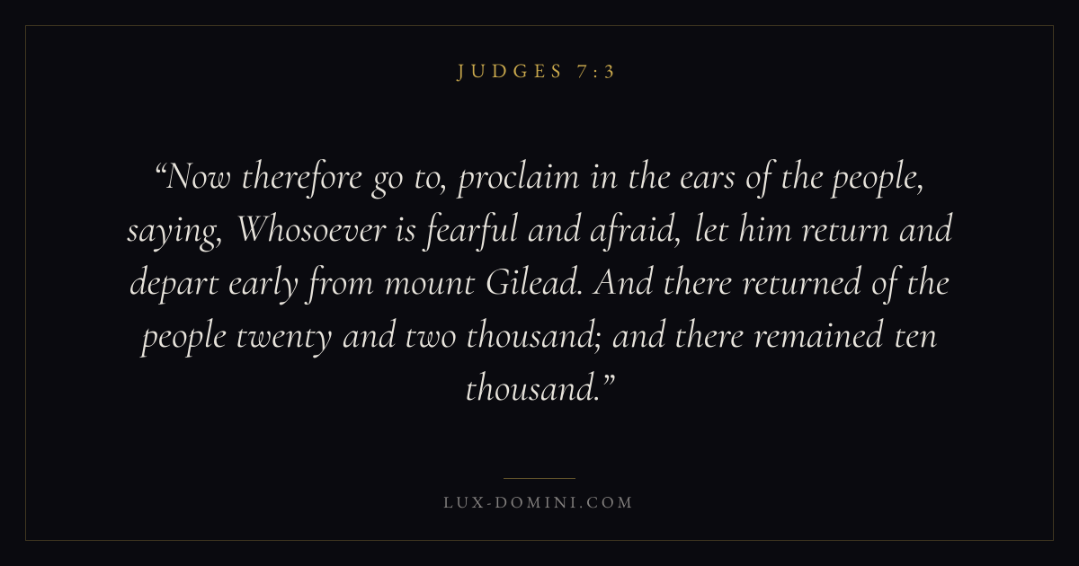 Now therefore go to, proclaim in the ears of the people, saying, Whosoever is fearful and afraid, let him return and depart early from mount Gilead. And there returned of the people twenty and two thousand; and there remained ten thousand.
