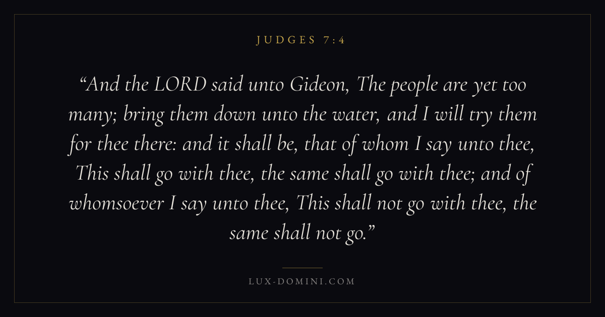 And the LORD said unto Gideon, The people are yet too many; bring them down unto the water, and I will try them for thee there: and it shall be, that of whom I say unto thee, This shall go with thee, the same shall go with thee; and of whomsoever I say unto thee, This shall not go with thee, the same shall not go.
