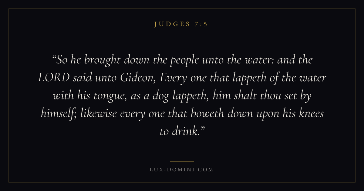 So he brought down the people unto the water: and the LORD said unto Gideon, Every one that lappeth of the water with his tongue, as a dog lappeth, him shalt thou set by himself; likewise every one that boweth down upon his knees to drink.
