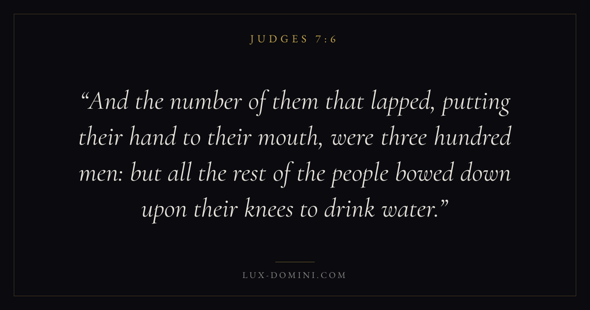 And the number of them that lapped, putting their hand to their mouth, were three hundred men: but all the rest of the people bowed down upon their knees to drink water.