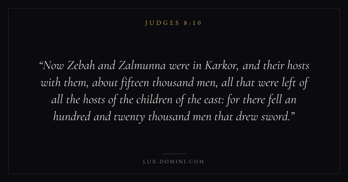 Now Zebah and Zalmunna were in Karkor, and their hosts with them, about fifteen thousand men, all that were left of all the hosts of the children of the east: for there fell an hundred and twenty thousand men that drew sword.