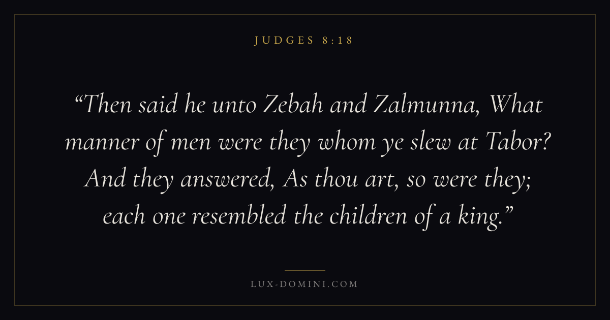 Then said he unto Zebah and Zalmunna, What manner of men were they whom ye slew at Tabor? And they answered, As thou art, so were they; each one resembled the children of a king.