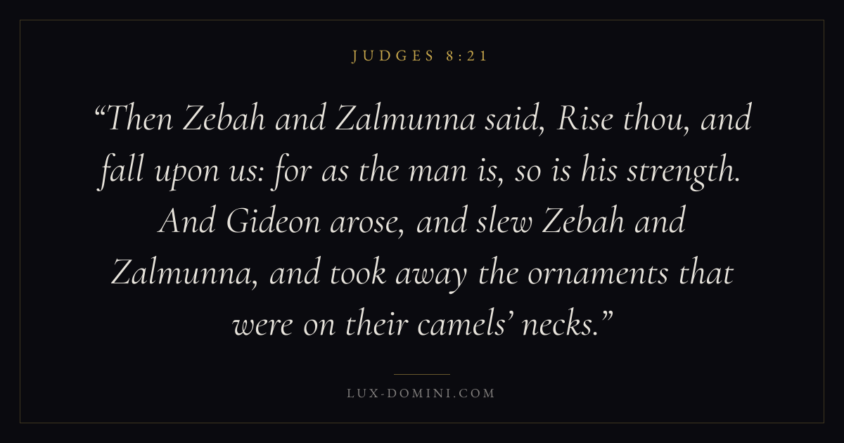 Then Zebah and Zalmunna said, Rise thou, and fall upon us: for as the man is, so is his strength. And Gideon arose, and slew Zebah and Zalmunna, and took away the ornaments that were on their camels’ necks.