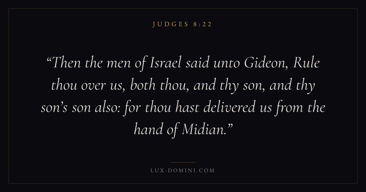 Then the men of Israel said unto Gideon, Rule thou over us, both thou, and thy son, and thy son’s son also: for thou hast delivered us from the hand of Midian.