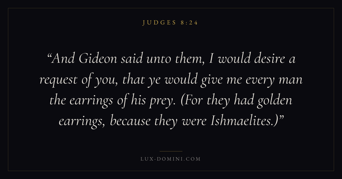 And Gideon said unto them, I would desire a request of you, that ye would give me every man the earrings of his prey. (For they had golden earrings, because they were Ishmaelites.)