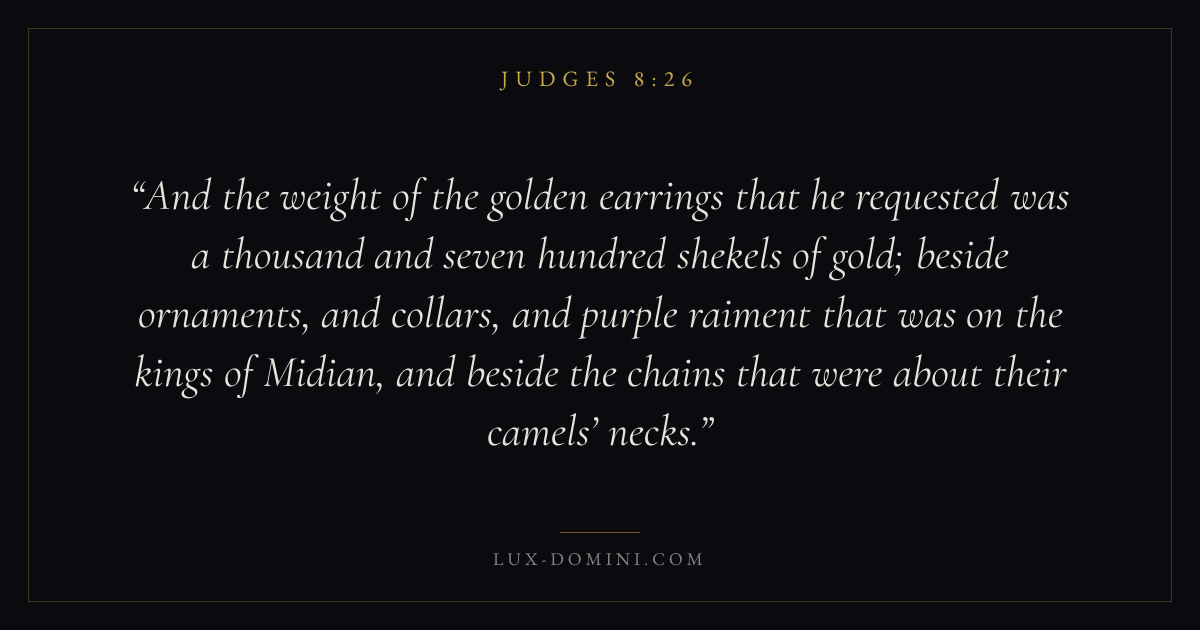 And the weight of the golden earrings that he requested was a thousand and seven hundred shekels of gold; beside ornaments, and collars, and purple raiment that was on the kings of Midian, and beside the chains that were about their camels’ necks.