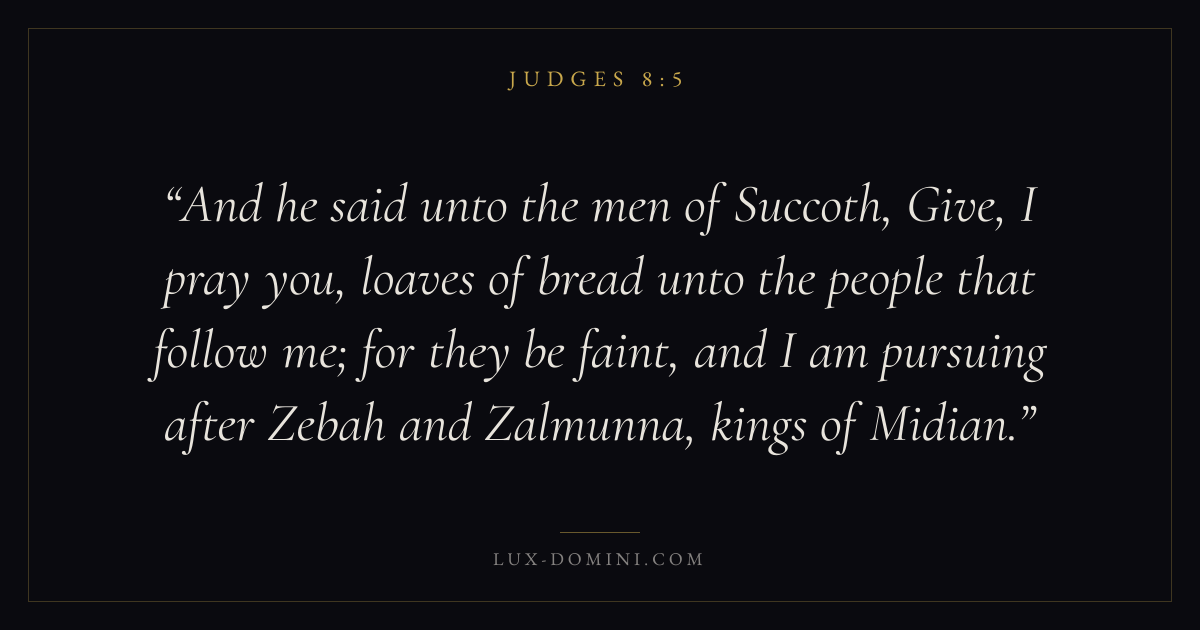 And he said unto the men of Succoth, Give, I pray you, loaves of bread unto the people that follow me; for they be faint, and I am pursuing after Zebah and Zalmunna, kings of Midian.