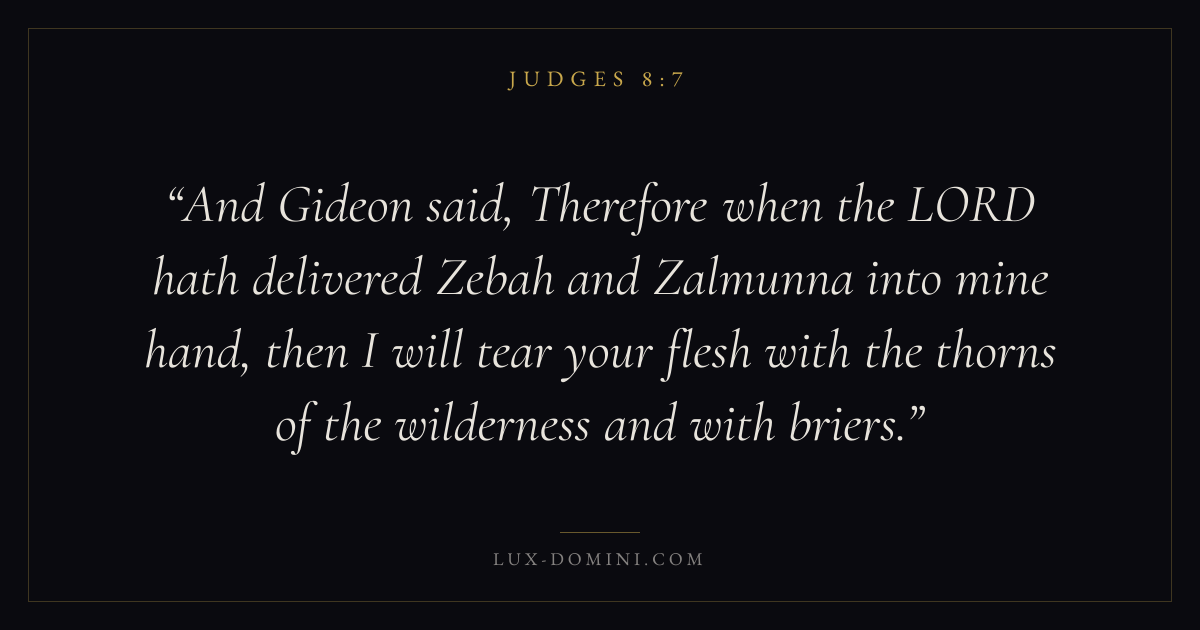 And Gideon said, Therefore when the LORD hath delivered Zebah and Zalmunna into mine hand, then I will tear your flesh with the thorns of the wilderness and with briers.