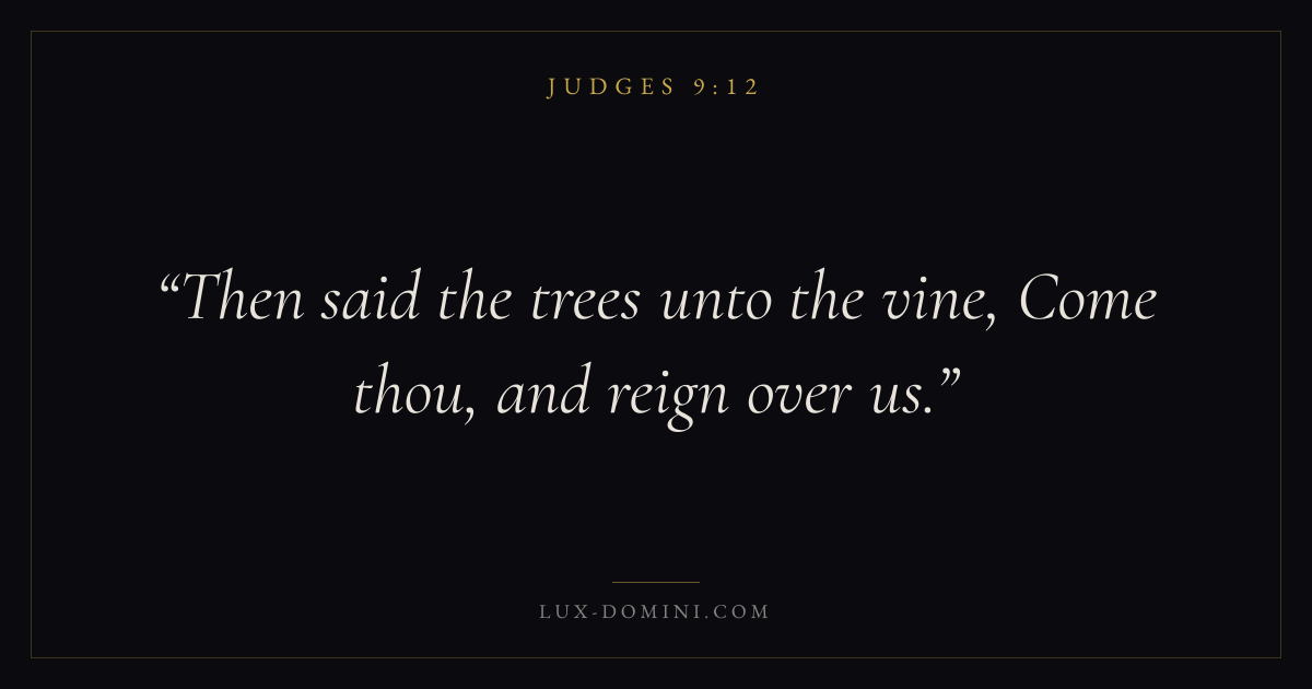 Books / Judges / Chapter 9 / Verse 12 ← Judges 9:11 Judges 9:12 Judges 9:13 → Then said the trees unto the vine, Come thou, and reign over us. Download verse card Share on Twitter Share on Facebook Pin it ✦ Key themes Justice and mercySalvationApostasyDeliverance Read with Judges 9:8Judges 9:9Micah 6:8Amos 5:24 Related topics Bible verses about justice and mercyBible verses about salvation ✦ Judges Chapter 9 verses V. 1 V. 2 V. 3 V. 4 V. 5 V. 6 V. 7 V. 8 V. 9 V. 10 V. 11 V. 12 V. 13 V. 14 V. 15 V. 16 V. 17 V. 18 V. 19 V. 20 V. 21 V. 22 V. 23 V. 24 V. 25 V. 26 V. 27 V. 28 V. 29 V. 30 V. 31 V. 32 V. 33 V. 34 V. 35 V. 36 V. 37 V. 38 V. 39 V. 40 V. 41 V. 42 V. 43 V. 44 V. 45 V. 46 V. 47 V. 48 V. 49 V. 50 V. 51 V. 52 V. 53 V. 54 V. 55 V. 56 V. 57