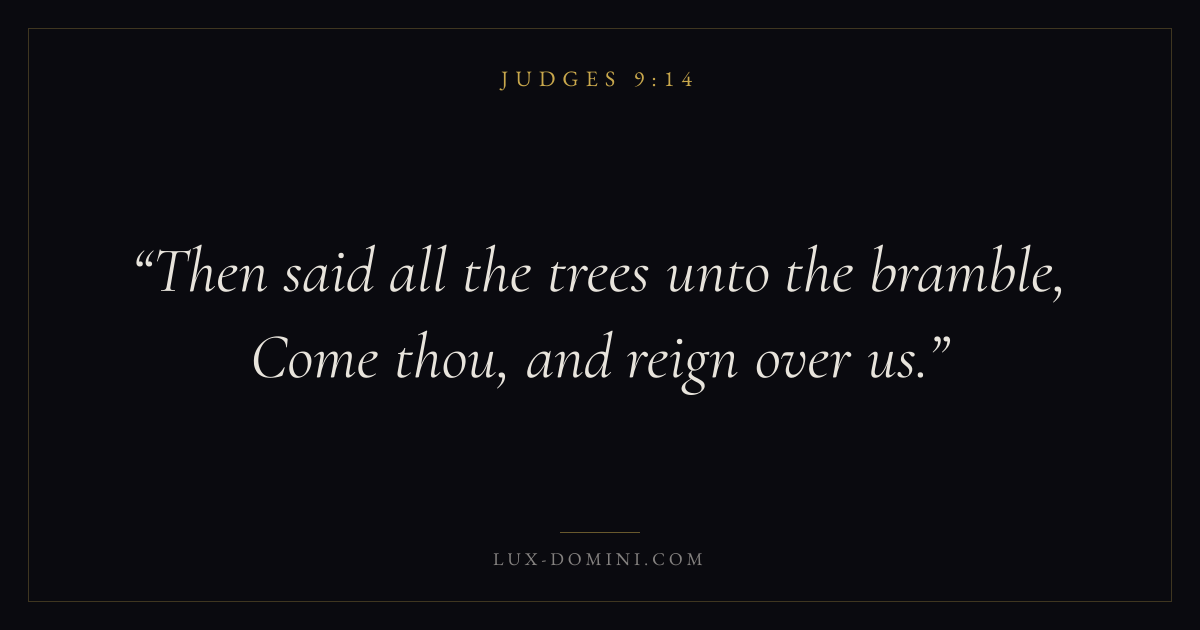 Books / Judges / Chapter 9 / Verse 14 ← Judges 9:13 Judges 9:14 Judges 9:15 → Then said all the trees unto the bramble, Come thou, and reign over us. Download verse card Share on Twitter Share on Facebook Pin it ✦ Key themes Justice and mercySalvationApostasyDeliverance Read with Judges 9:13Judges 9:15Micah 6:8Amos 5:24 Related topics Bible verses about justice and mercyBible verses about salvation ✦ Judges Chapter 9 verses V. 1 V. 2 V. 3 V. 4 V. 5 V. 6 V. 7 V. 8 V. 9 V. 10 V. 11 V. 12 V. 13 V. 14 V. 15 V. 16 V. 17 V. 18 V. 19 V. 20 V. 21 V. 22 V. 23 V. 24 V. 25 V. 26 V. 27 V. 28 V. 29 V. 30 V. 31 V. 32 V. 33 V. 34 V. 35 V. 36 V. 37 V. 38 V. 39 V. 40 V. 41 V. 42 V. 43 V. 44 V. 45 V. 46 V. 47 V. 48 V. 49 V. 50 V. 51 V. 52 V. 53 V. 54 V. 55 V. 56 V. 57