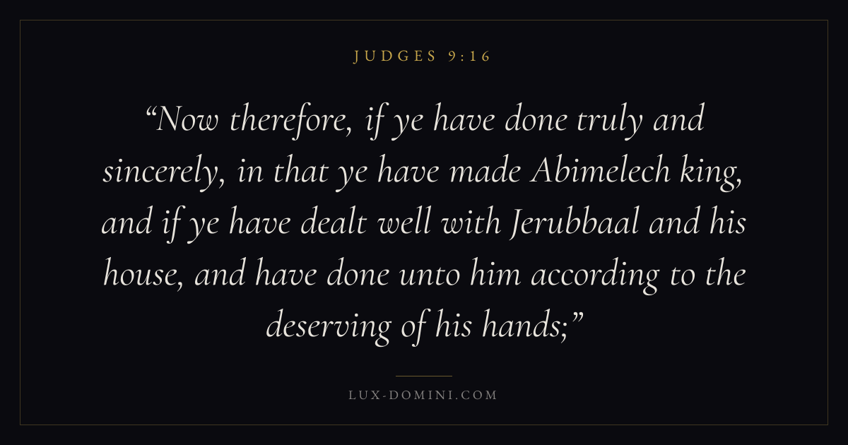 Now therefore, if ye have done truly and sincerely, in that ye have made Abimelech king, and if ye have dealt well with Jerubbaal and his house, and have done unto him according to the deserving of his hands;