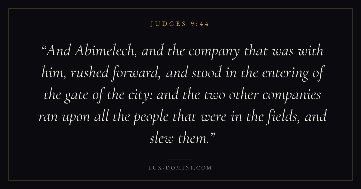 And Abimelech, and the company that was with him, rushed forward, and stood in the entering of the gate of the city: and the two other companies ran upon all the people that were in the fields, and slew them.