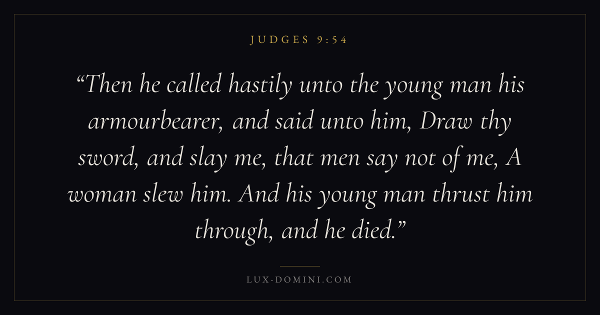 Then he called hastily unto the young man his armourbearer, and said unto him, Draw thy sword, and slay me, that men say not of me, A woman slew him. And his young man thrust him through, and he died.