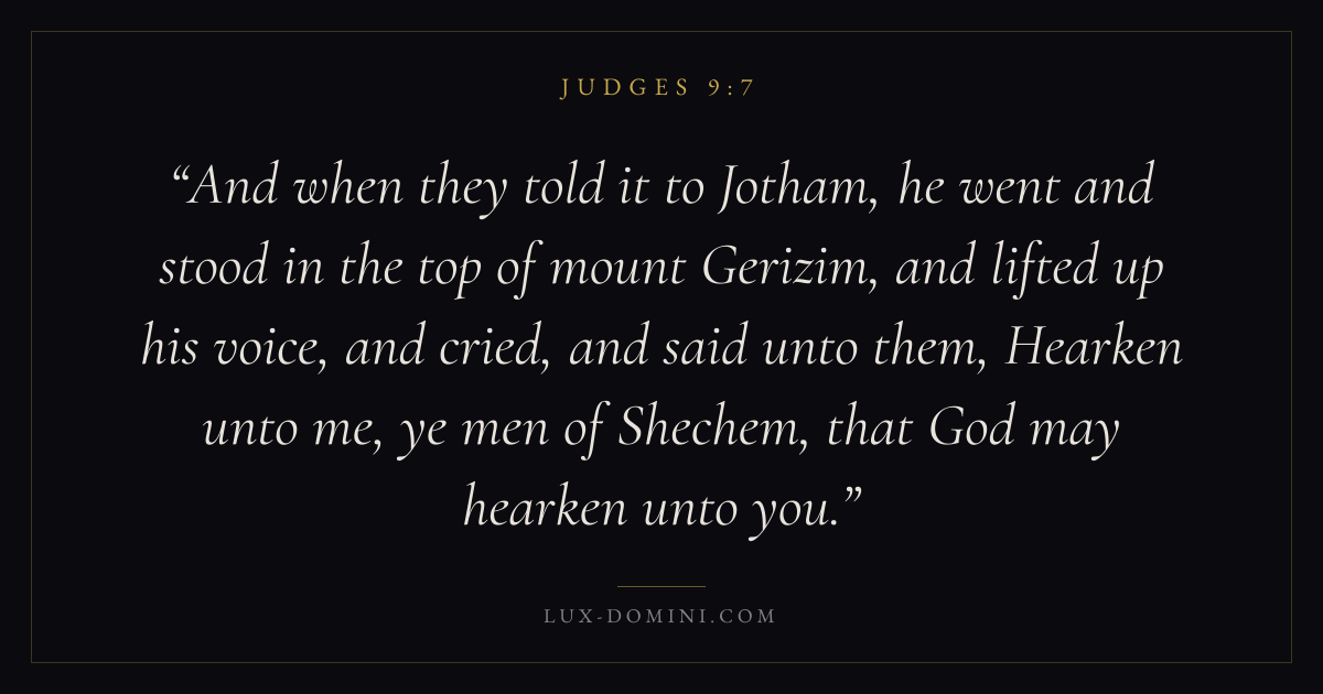 And when they told it to Jotham, he went and stood in the top of mount Gerizim, and lifted up his voice, and cried, and said unto them, Hearken unto me, ye men of Shechem, that God may hearken unto you.