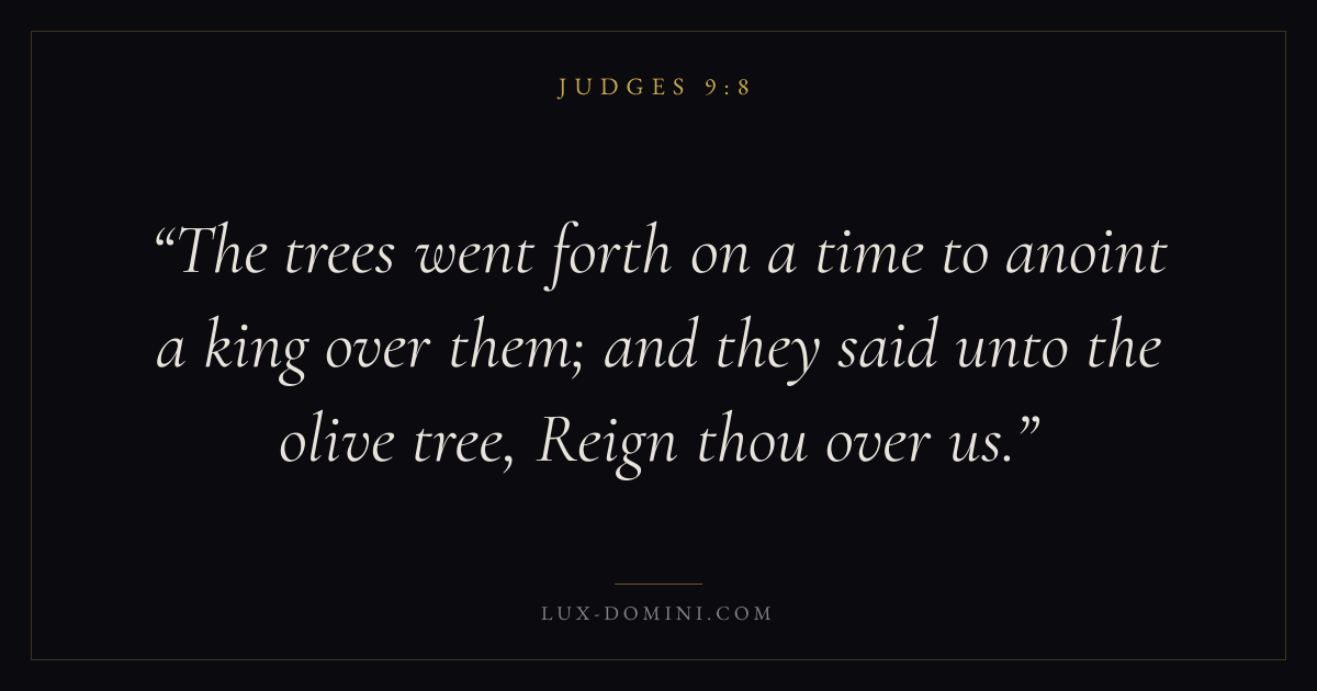 The trees went forth on a time to anoint a king over them; and they said unto the olive tree, Reign thou over us.