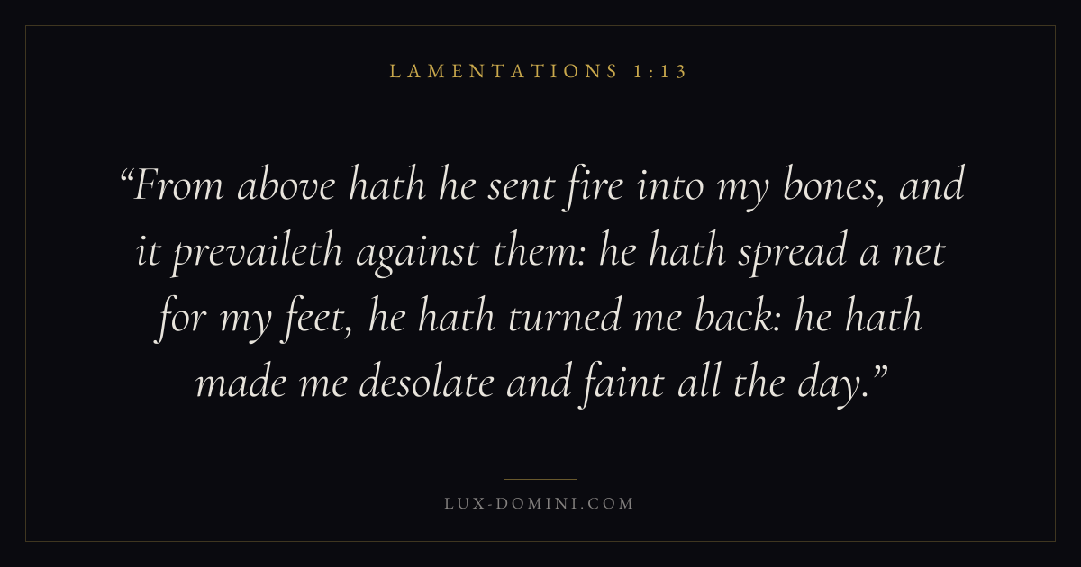 From above hath he sent fire into my bones, and it prevaileth against them: he hath spread a net for my feet, he hath turned me back: he hath made me desolate and faint all the day.